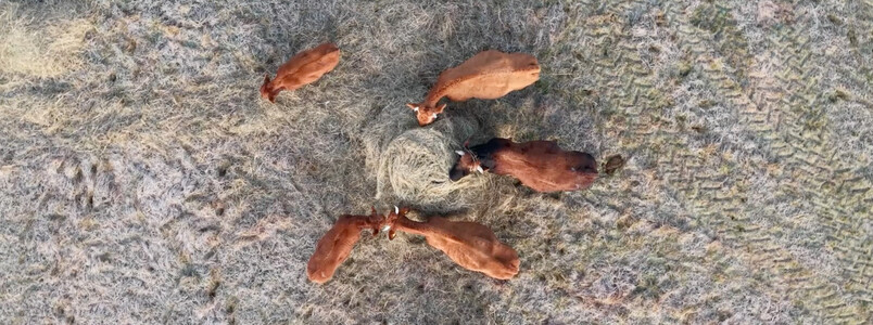 Die Rinderherde erhält ausschließlich Gras als Futter und wird im Winter mit Heu versorgt. Lediglich in der laktierenden Phase, wenn das Sommergras aufgrund von Trockenheit zu wenig Energie enthält, füttern wir zusätzlich Kraftfutter zu.