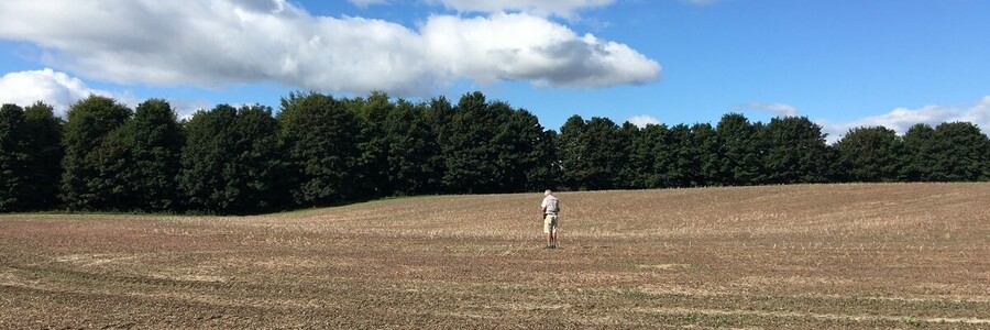 Christopher und Sheila Cooke haben 2016 das englische Savory Hub 3LM gegründet und arbeiten seitdem an der Entwicklung und Verfeinerung der Methode EOV. Zusammen mit Christopher besuchte Katja zwei Farmen in Northumberland. Hier liegt ein grünes, hügeliges Land nahe der Stadt Newcastle. Rechts und links vom River Thyne wechseln sich Weiden und Feldern mit kleinen Wäldchen ab. Viele sind von sorgsam aufgeschichteten Steinwällen oder von grünen Hecken eingerahmt. Hier gibt es sie noch, die Hecken, doch ansonsten sind die Weiden groß: 10 – 15 ha ist keine Seltenheit. Christopher machte darauf aufmerksam, dass beinahe alle Hecken und Wälle gut 30 cm, manchmal 50 cm höher liegen als das Land selbst. Dieser Höhenunterschied zeigt die Erosion an, die durch das Management der Menschen in den letzten Jahrzehnten und Jahrhunderten erfolgte. Das erschreckende: 50 cm Erosion macht bei 10 ha einen Verlust von 50.000 Kubikmeter vom Mutterboden.