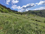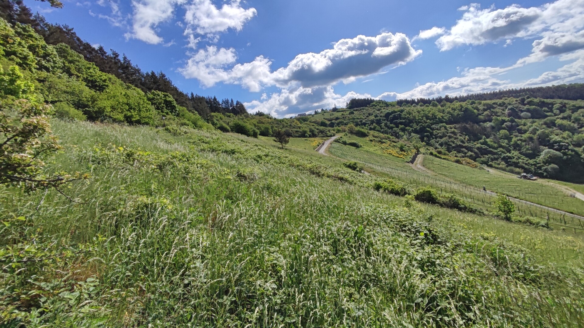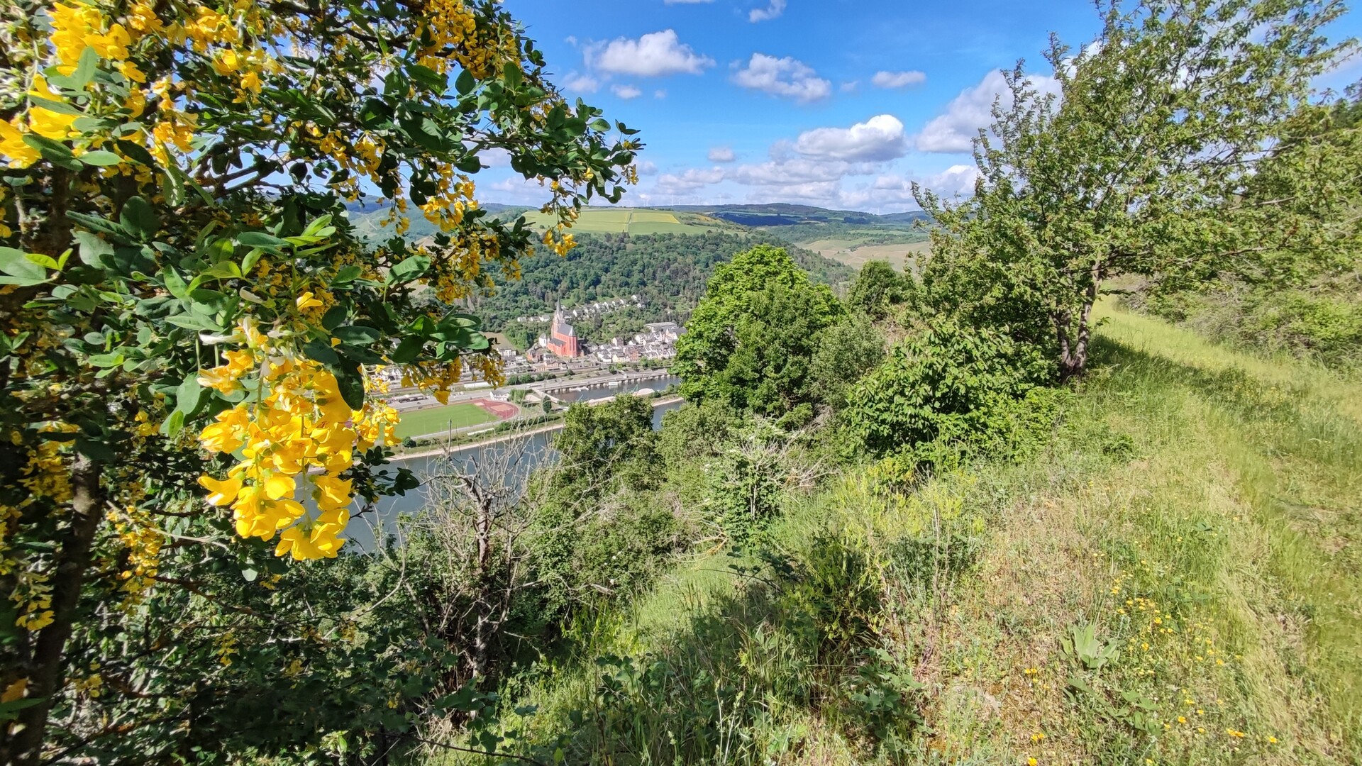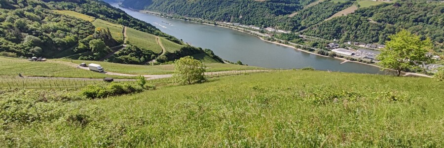 Wiese im Gebiet der Dörscheider Heide vor dem Panorama des Mittelrheins