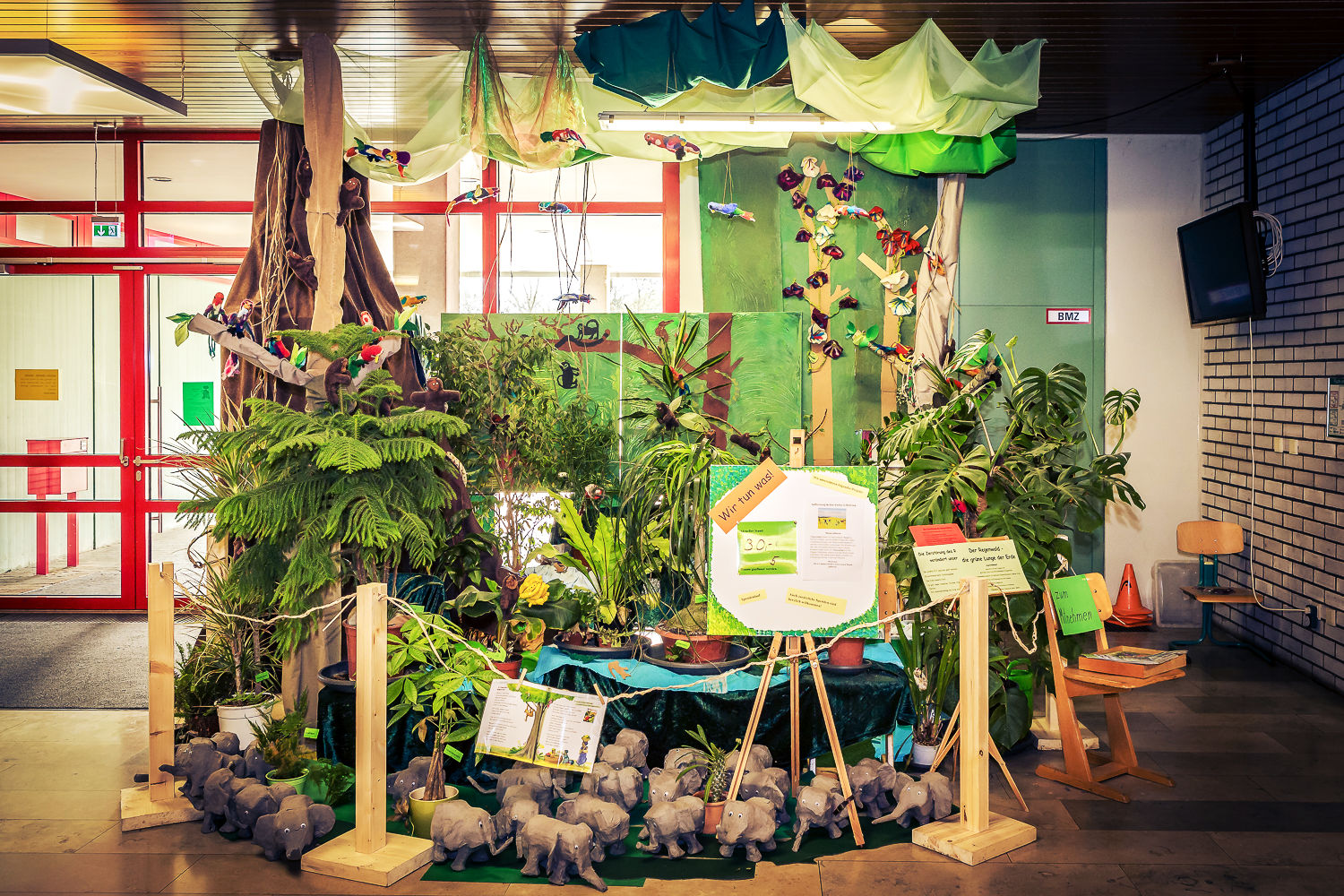 Die Grundschule Heiligenstadt beschäftigt sich seit einigen Jahren intensiv mit Umweltbildung. Sie wird 2016 bereits zum fünften Mal mit dem Titel „Umweltschule in Europa/ Internationale Agenda 21 Schule“ ausgezeichnet werden. Im vergangenem Schuljahr (15/16) wurde u.a. das Thema „Schützt den Regenwald“ mit allen Sinnen bearbeitet. Die wichtige Bedeutung des Regenwaldes als grüne Lunge der Erde wurde besonders hervorgehoben.Regenwaldmodell mitten in der Schule