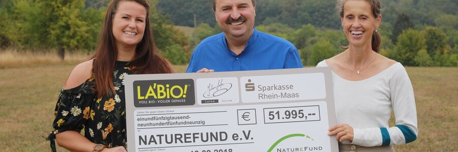 Über 51.995 € hat der Bio-Kräuterproduzent LA’BiO! im Jahr 2018 für die Naturschutzarbeit der Organisation Naturefund in Deutschland und weltweit gespendet. „Das ist die bislang höchste Summe, die wir von LA’BiO! erhalten haben und mit der wir viel Gutes für die Natur tun können“, freut sich Katja Wiese von Naturefund bei der Scheckübergabe mit Spitzenkoch Johann Lafer und Danny Rankers von LA’BiO!