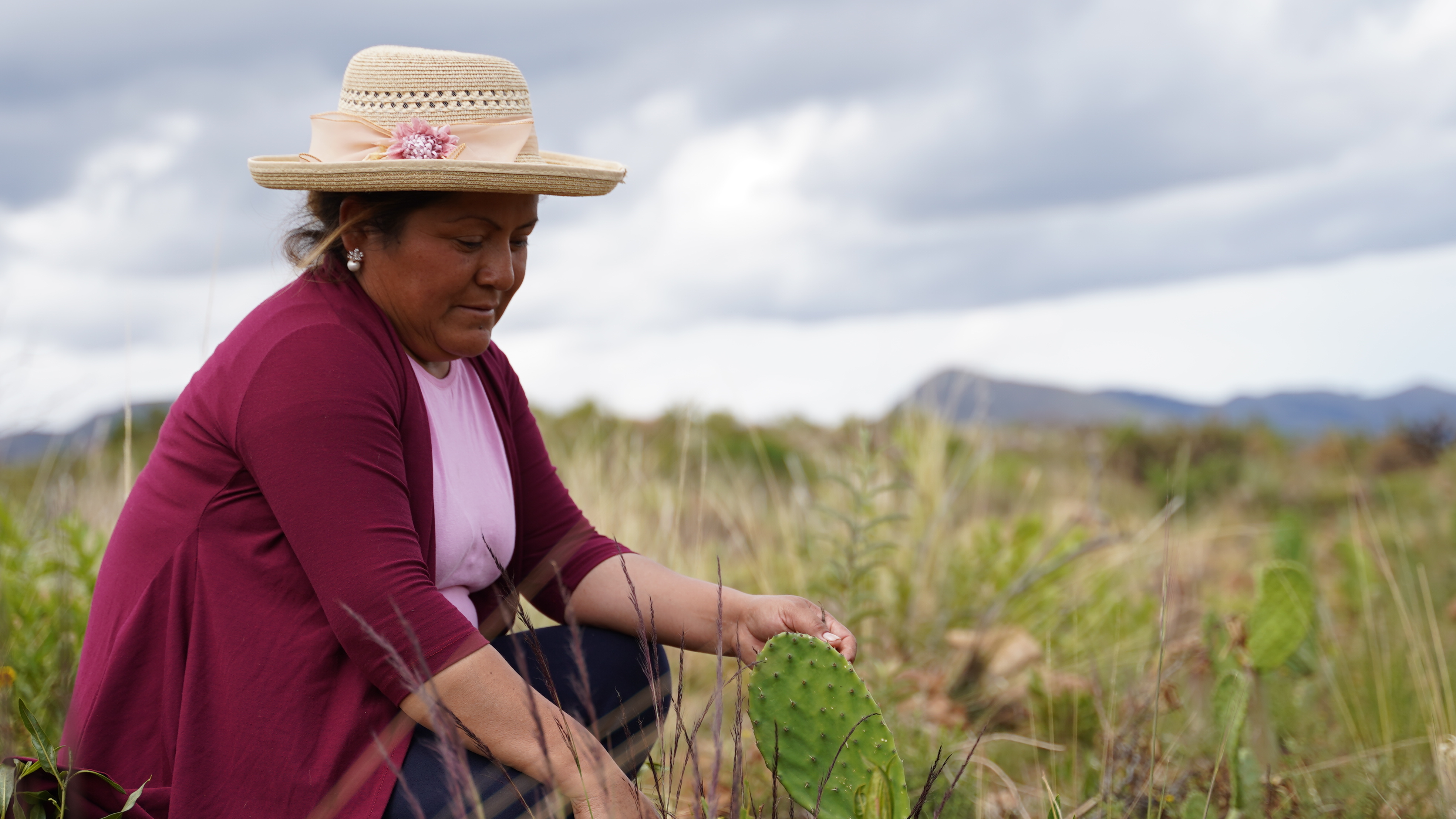 Eine Kleinbäuerin zeigt Kaktusfeigenblätter auf ihrer Trockenparzelle in Bolivien.