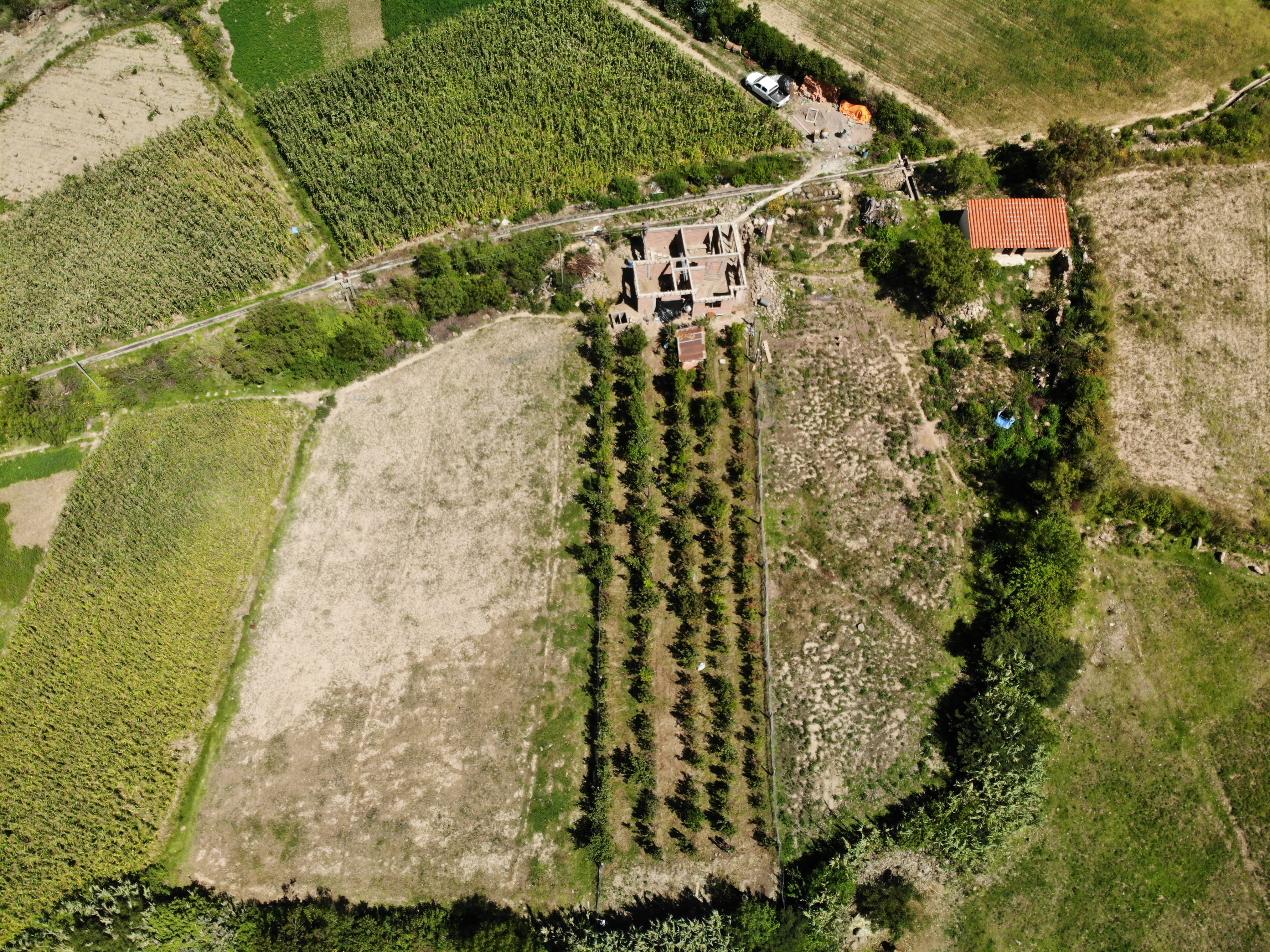 Drohnenaufnahme einer Dynamischen Agroforstparzelle im Hochland von Bolivien neben landwirtschaftlichen Flächen ohne Baumbewuchs