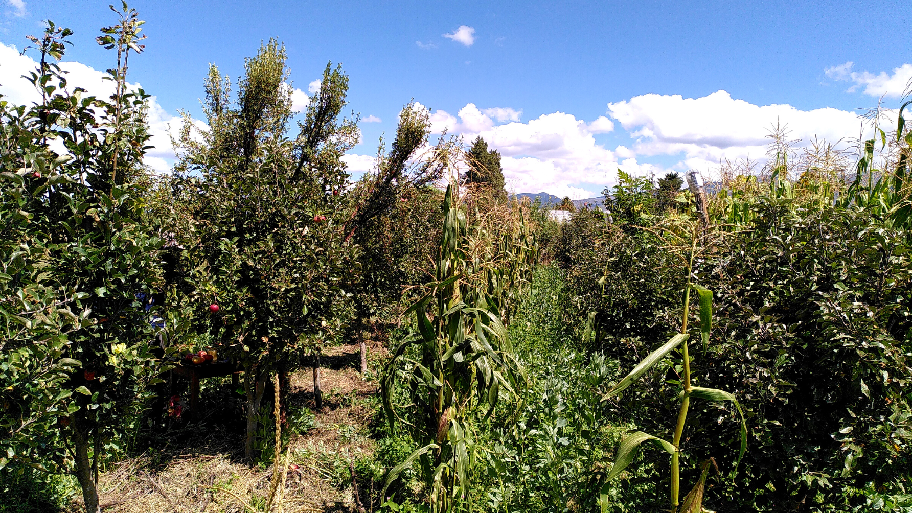 Dynamische Agroforstparzelle in Bolivien, in der neben Apfelbäumen auch native Baumarten wachsen