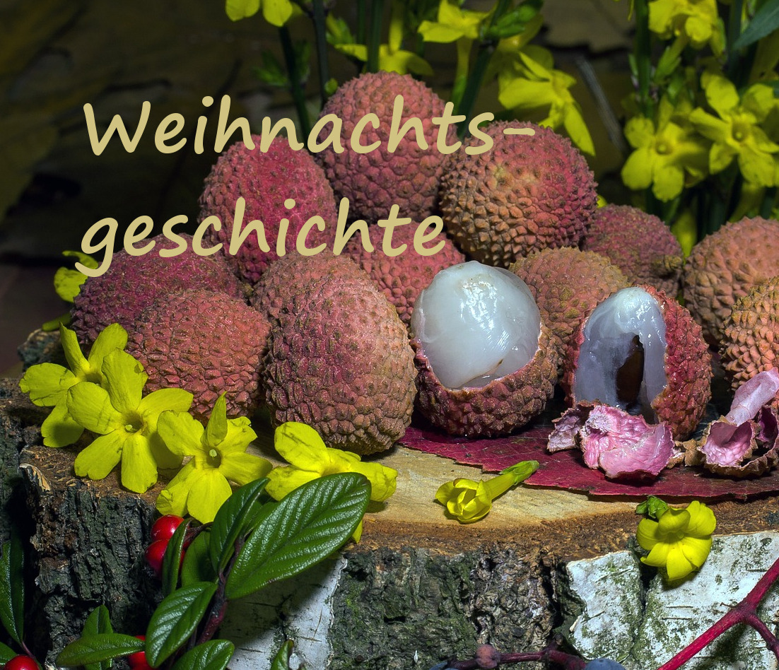 Doch dieses Mal kommen sie zu mir. In ihre Körbe pflücken sie so viele meiner Früchte, wie sie erreichen können. „So, das ist genug für heute Abend“, sagt irgendwann die Frau. Das kleine Mädchen schmollt erst: „Man kann doch an Weihnachten nie genug Litschis haben.“ Der Vater lächelt: „Morgen kannst du ja noch mehr holen. Für das heutige Fest haben wir mehr als genug.“ Ich bin stolz – nicht nur, dass allen meine Früchte schmecken, sie versüßen ihnen sogar das Weihnachtsfest. Als sie gehen, dreht sich das Mädchen nochmal um und schaut mich an. „Frohe Weihnachten!“, denke ich überglücklich.