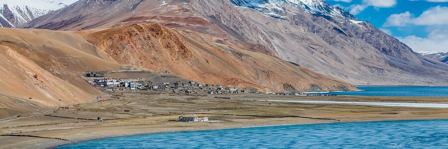 Salzsee mit vereinzelten Häuser vor einem Bergpanorama