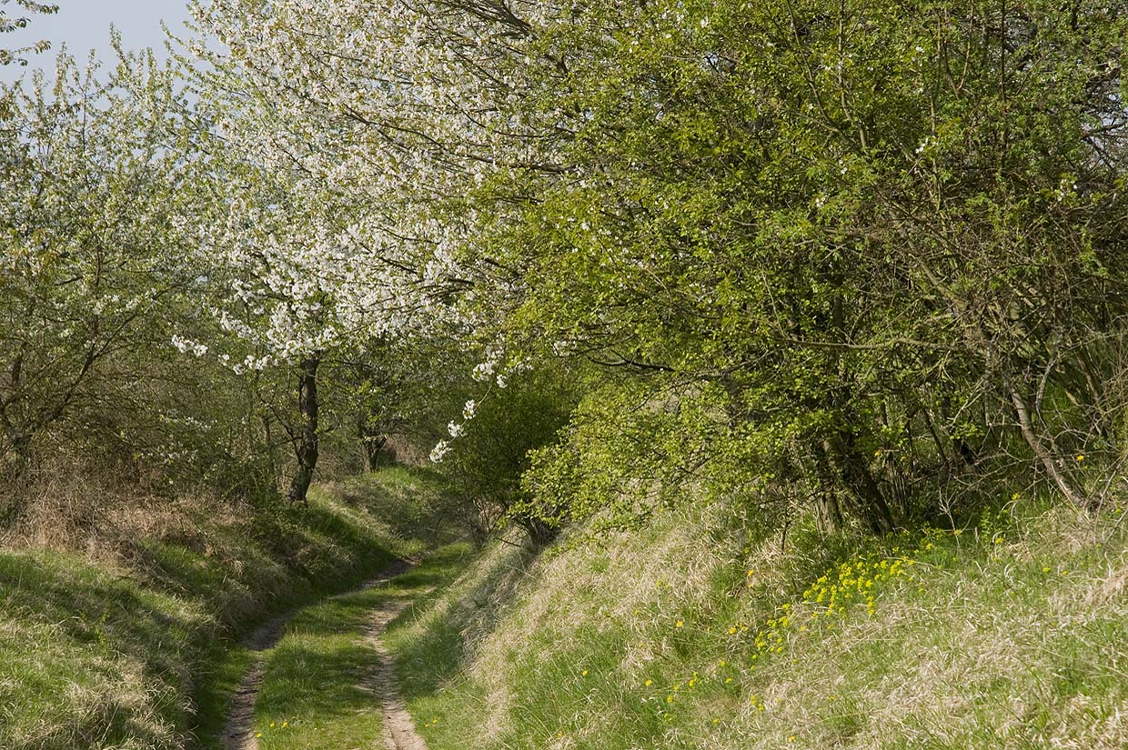 Von den Ortschaften aus führen unbefestigte, von Obstbaumreihen gesäumte Wege in diese Hügellandschaft. Bei Regen sind diese Wege kaum zu passieren, denn die dann feuchte Lösslehmauflage macht auch jede Fuß-Wanderung zu einer abenteuerreichen Schlitterpartie. Das dies immer so war, davon zeugen die vielen tief eingeschnittenen Hohlwege im Gebiet. Jedes Pferdefuhrwerk hat früher – auf dem Weg in den nahen Wald oder in die Streuobstbestände – Furchen im Weg hinterlassen. Diese Furchen wurden vom nächsten Regen ausgespült. Über die Jahrhunderte haben sich so bis zu 4 Meter tiefe Hohlwege ausgewaschen. In den 90 Grad steilen – und deshalb unbewachsenen, sonnenexponierten Hohlwegwänden haben sich Wildbienen eingenistet. Die Lösslehmwände sind gesprenkelt mit kleinen Löchern – jedes Jahr bauen die Wildbienen neue Bruthöhlen in die Lehmwand.