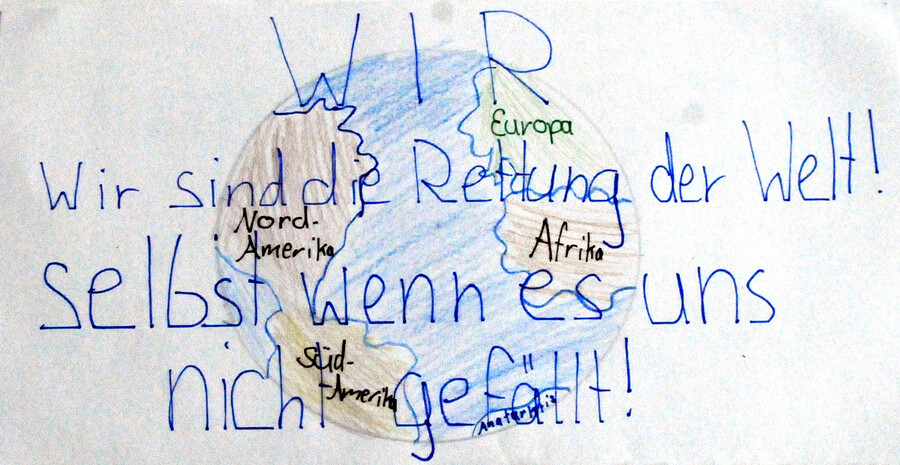 Bei den Schülern und Schülerinnen entsteht die Idee, die Postkarten von Naturefund für einen Euro zu verkaufen. Gleich werden die ersten "Finanzkonzepte" entwickelt und ein Schüler fragt, ob er in einer Etage mehr Geld für eine Postkarte nehmen könne, als in einer anderen: "Tja, ich bin eben Geschäftsmann!" sagt der Knirps mit frechem Grinsen. Die Teilnehmerinnen und Teilnehmer der Kunst AG kommen aus unterschiedlichen Klassen, ältere und jüngere Kindern entwickeln gemeinsam Ideen und führen sie aus. Eine Gruppe hat eine riesige Weltkarte zusammengebastelt und trägt dort die Länder ein, in denen die Schutzgebiete von Naturefund liegen oder in denen Naturefund wieder aufgeforstet hat.Es macht Spaß zu helfen