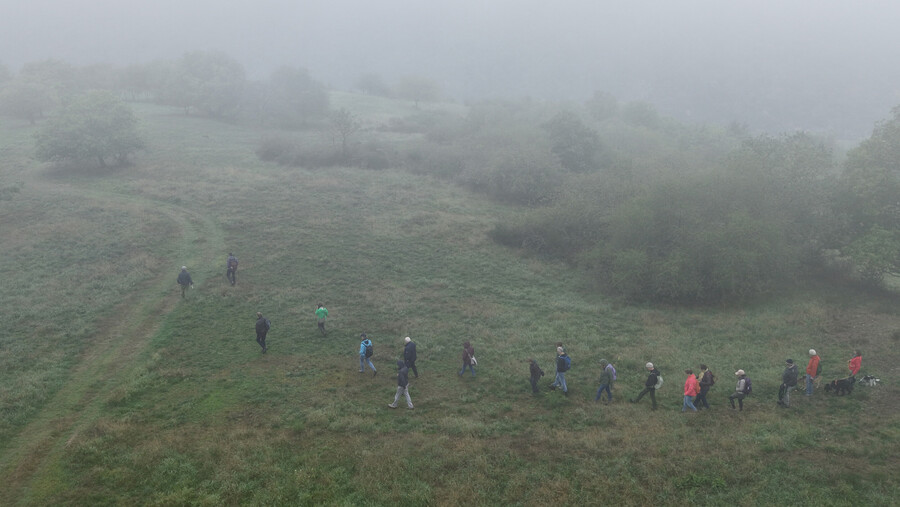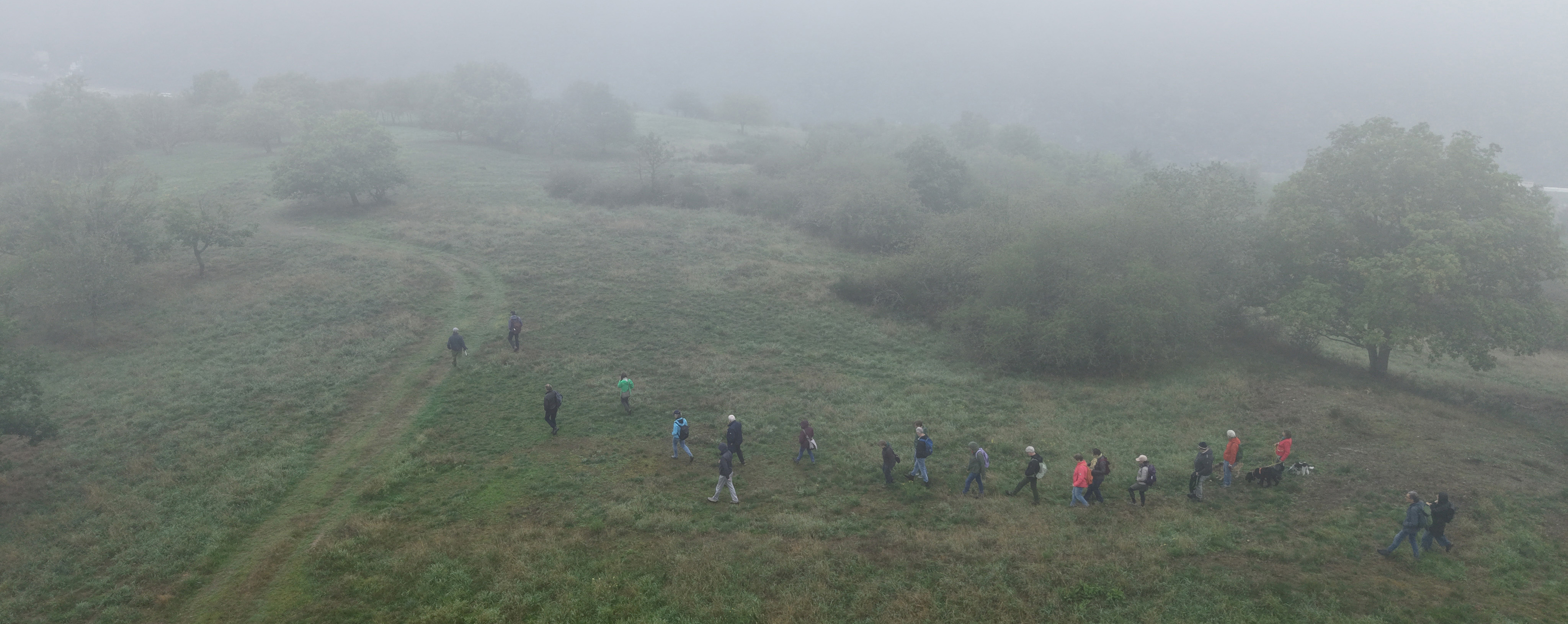 Auch bei unserer Wanderung durch die Dörscheider Heide an einem Herbstwochenende konnten wir diese Resonanz spüren – zwischen uns und der Landschaft, die uns umgab. Etwa 20 Menschen zogen durch die nebelverhangenen Savannenhänge des Mittelrheintals, einem der artenreichsten Orte Deutschlands. Die feuchte Luft, das gedämpfte Licht und die Farben des Herbstes schufen eine besondere Stimmung. Und trotz Kühle und Nebel zeigten sich uns einige der unzähligen Tag- und Nachtfalter, die diesen Ort so einzigartig machen.