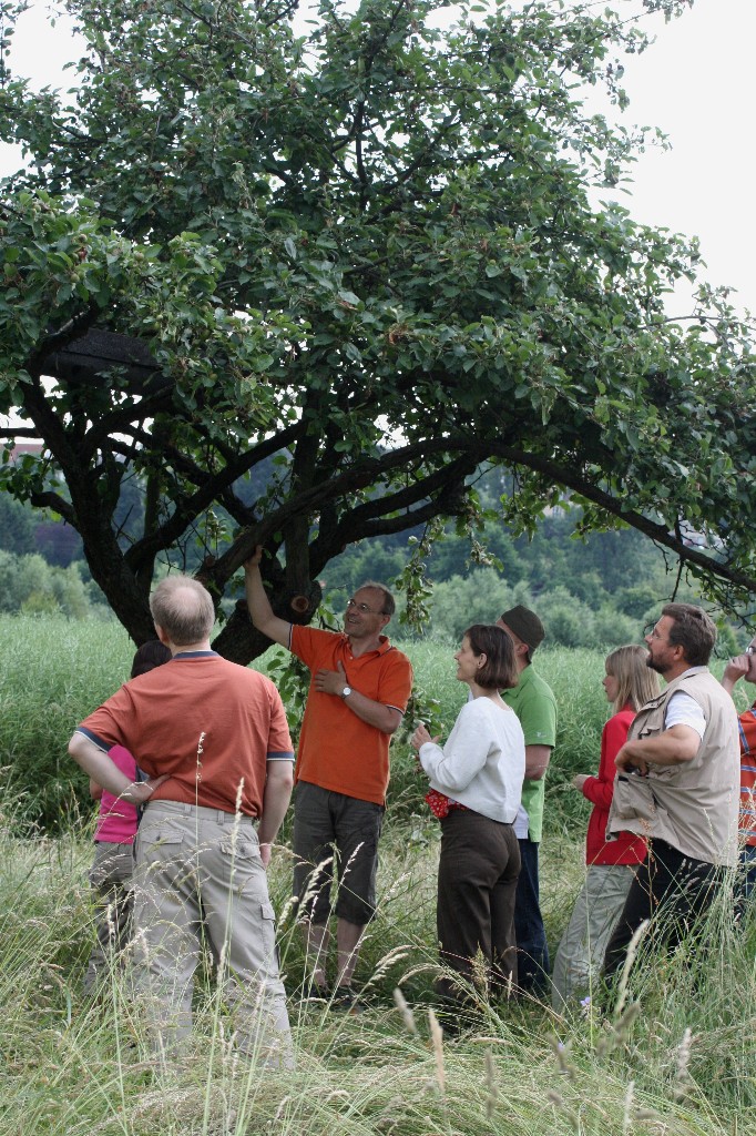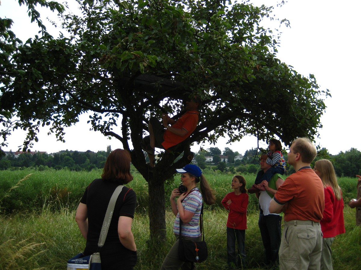 Die Obstbäume blühenDie Streuobstwiese an der NiddaSteinkauz in der NachtBrutröhre für KäuzchenErklärung zur BrutröhreLeere BrutröhreWiesenwanderungRotkehlchenKinder entdecken einen SteinkauzAuge in Auge mit dem SteinkauzSpeyerlingStreuobstwiesenschnaps