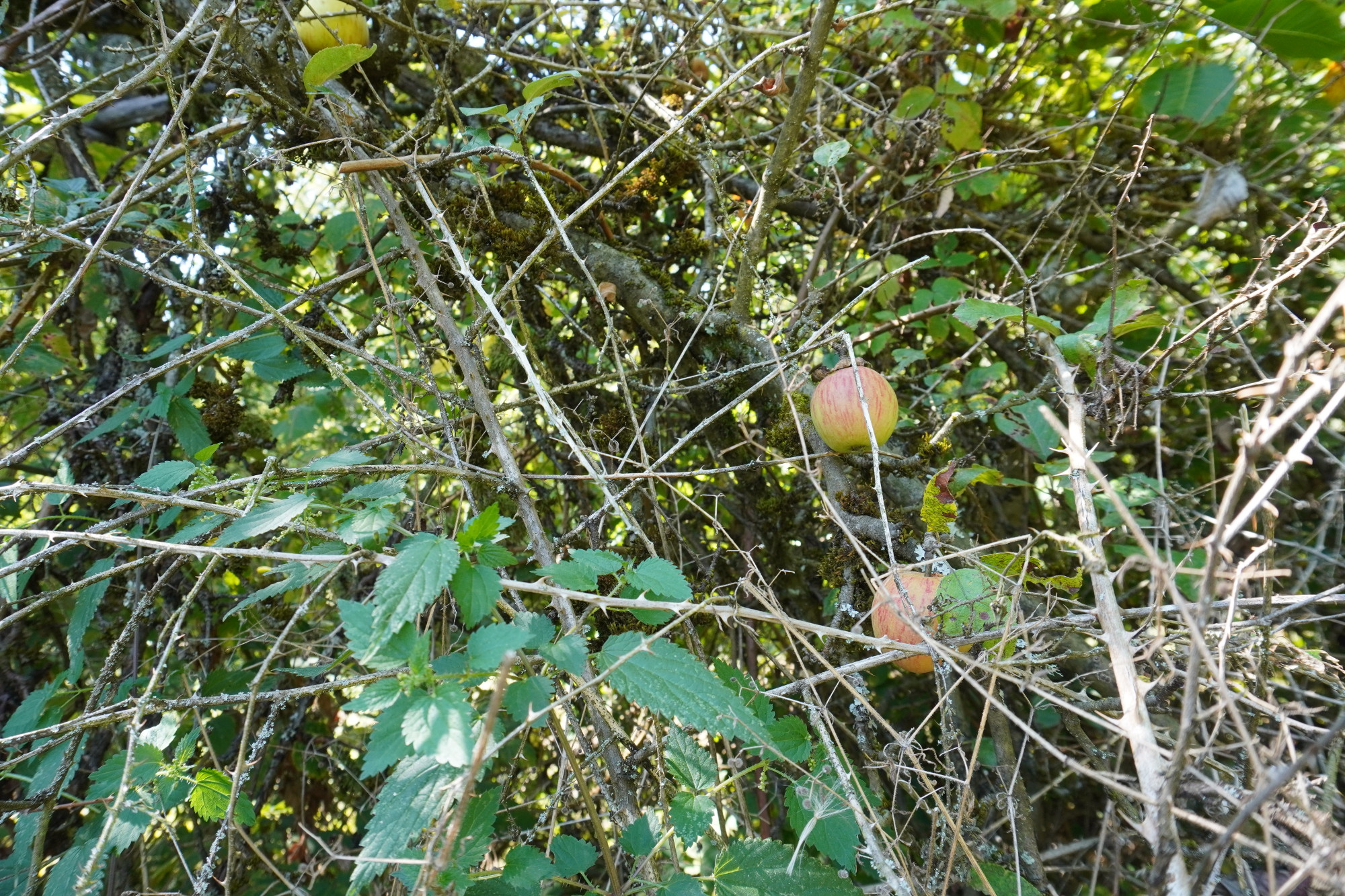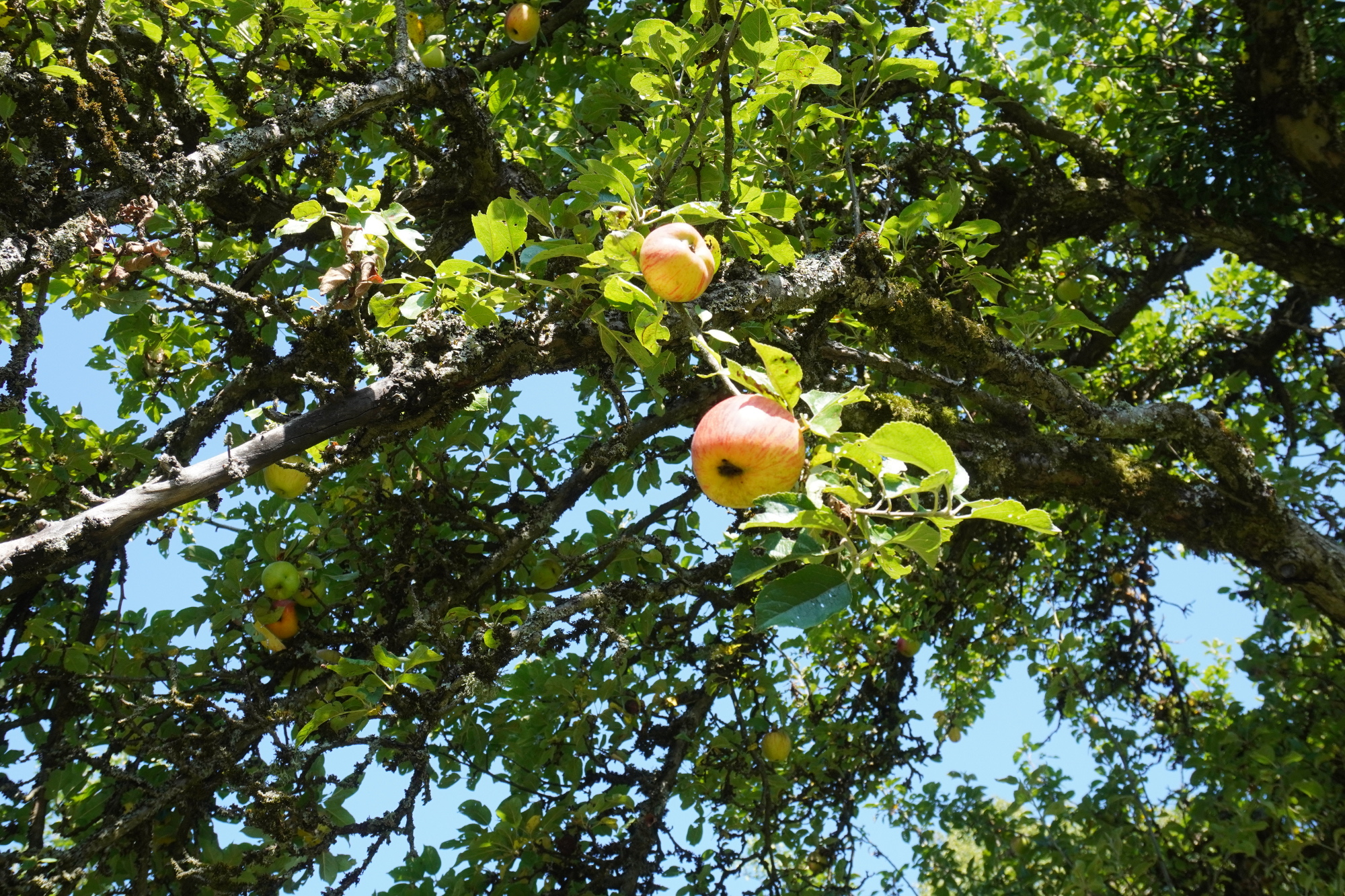 Äpfel hängen hinter Gestrüpp an einem Baum