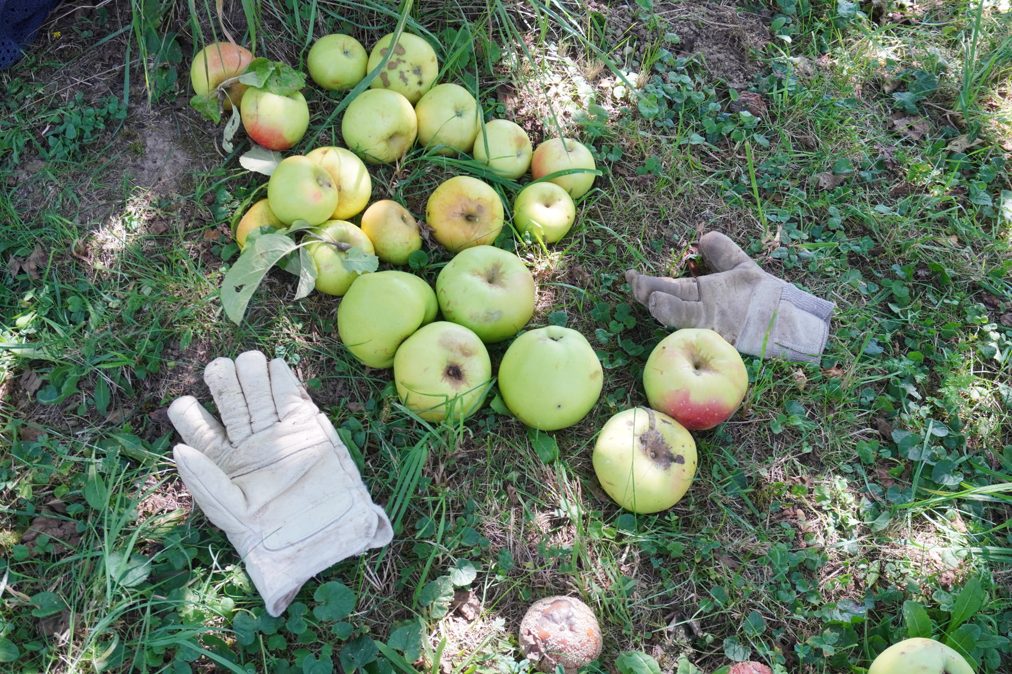 Grüne Äpfel und Handschuhe liegen auf dem Boden