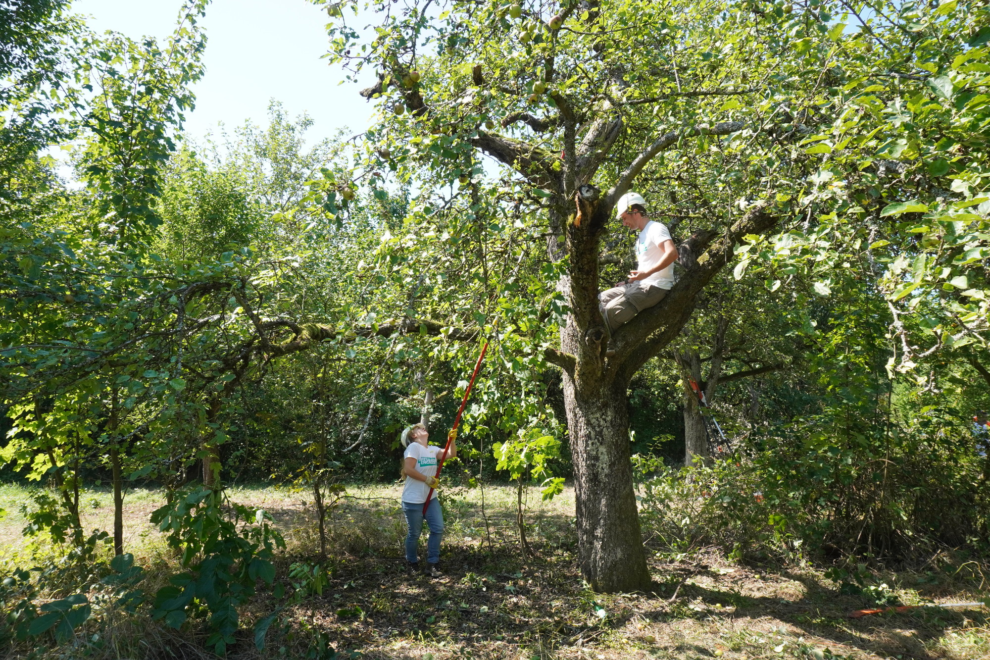 Zwei Personen schneiden Apfelbäume
