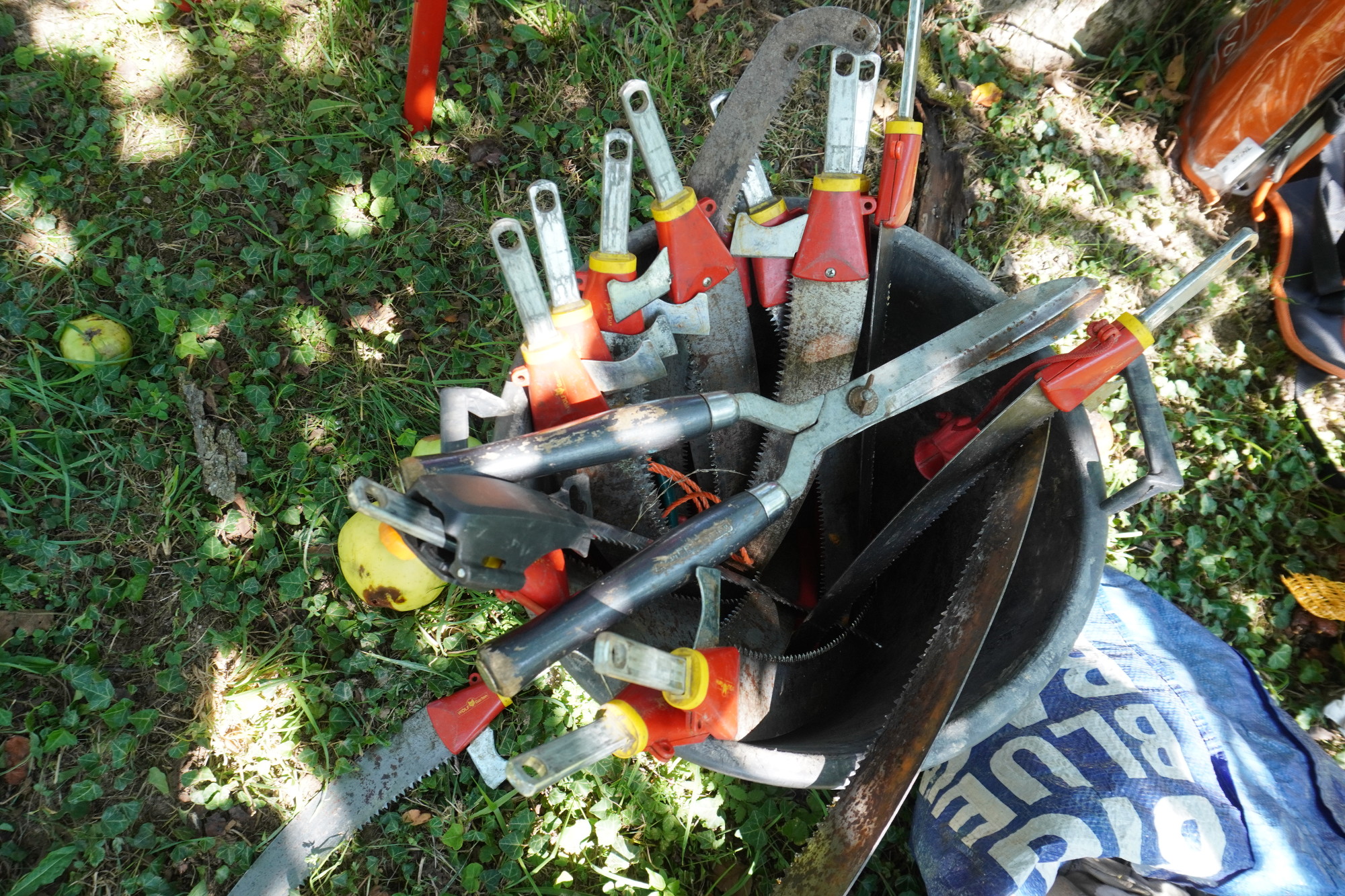 Sägen um Bäume zu beschneiden liegen in einem Eimer