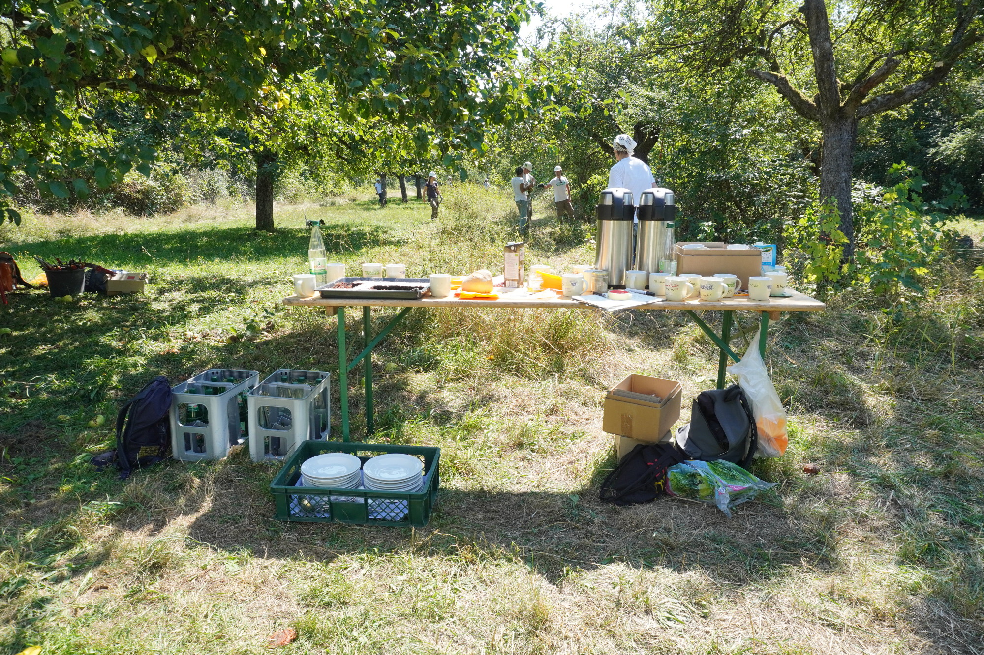 Biertisch mit Essen und Trinken steht auf Streuobstwiese