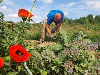 Ein Mann rupft Unkraut bei einem dicht bewachsenen Dynamischen Agroforst Acker