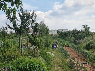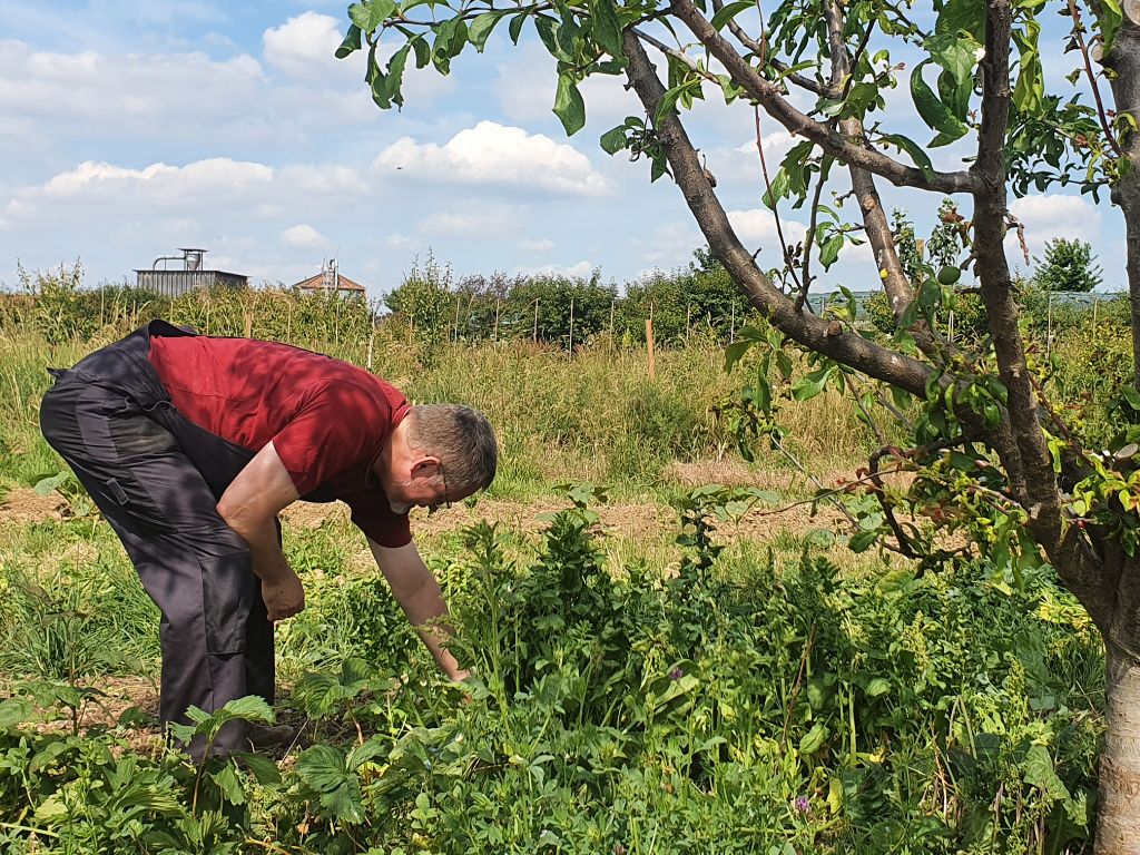 Mann rupft Unkraut vor dicht bewachsener Parzelle