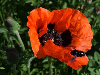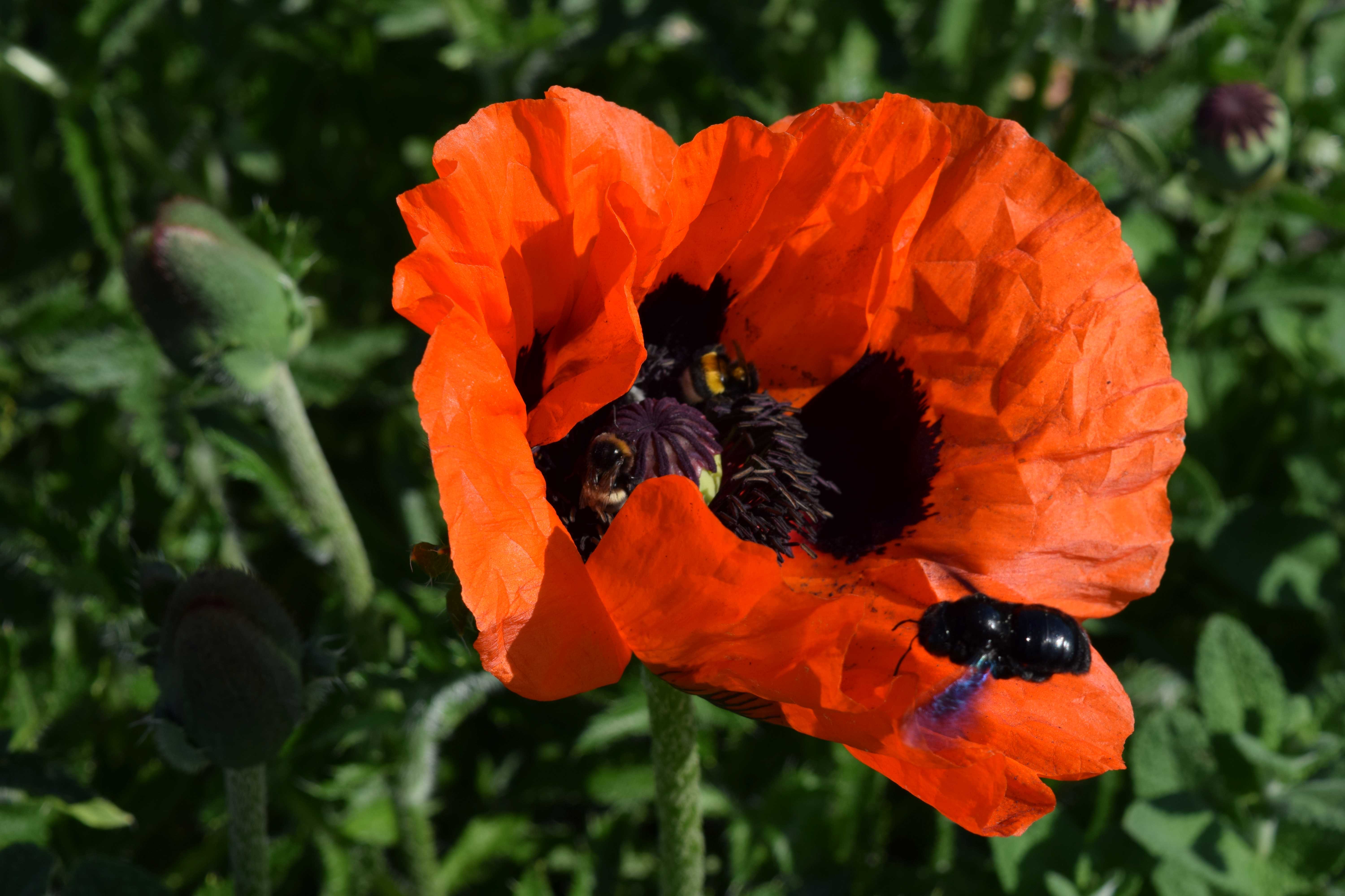 Holzbiene fliegt zu einer Mohnblume, in der bereits zwei Hummeln sitzen und Nektar sammeln