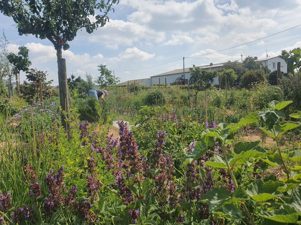 Dicht bewachsene Dynamische Agroforst Reihe mit Blumen, Bäumen, Kräutern, Gemüse und Büschen