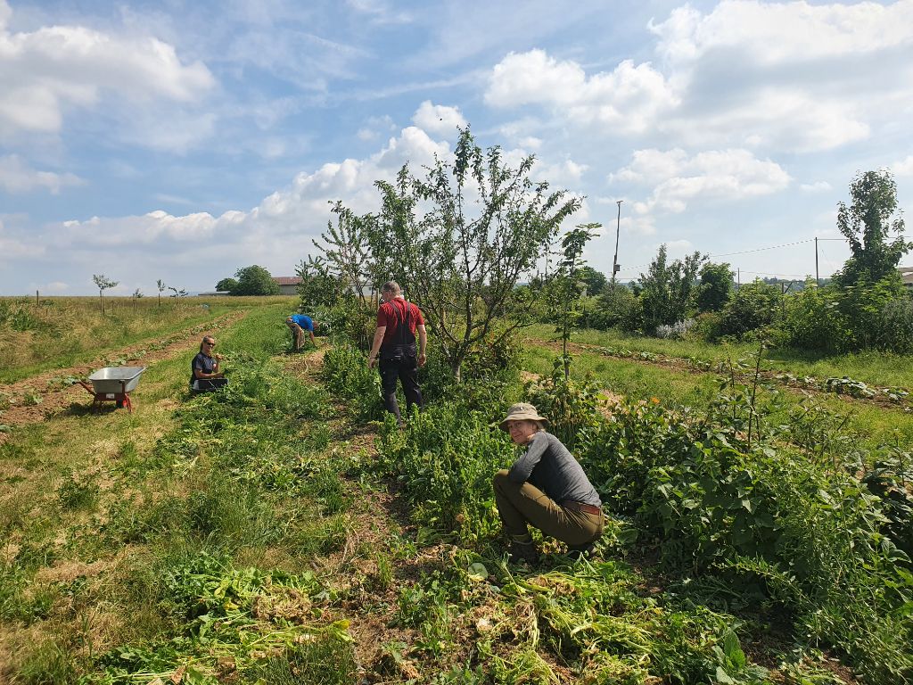 Mehrere Menschen gärtnern auf einem Dynamischen Agroforst Acker