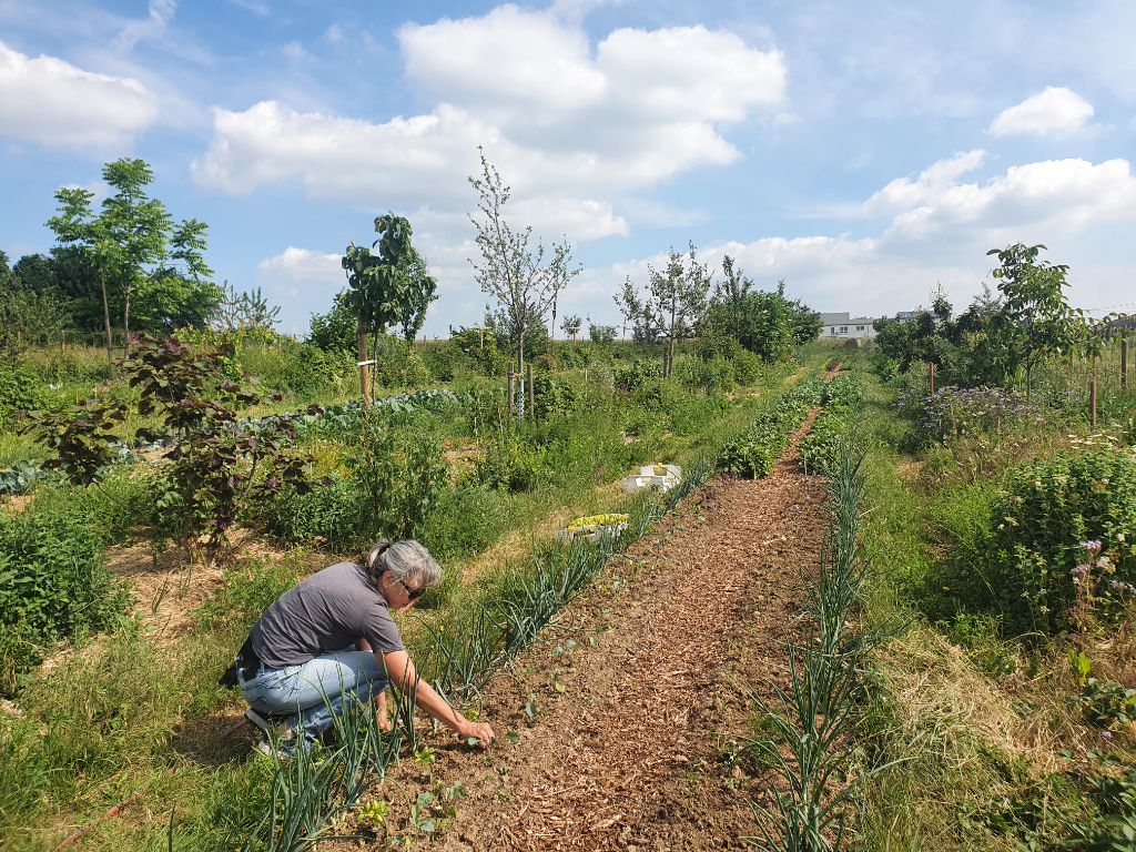 Frau kniet an einer Dynamischen Agroforst Reihe auf einem dicht und vielfältig bewachsenen Acker