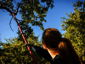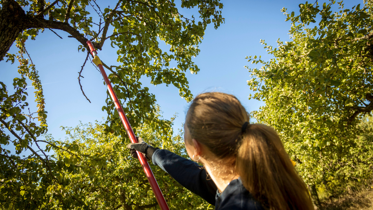 Eine Frau schneidet Totholz aus einem Apfelbaum auf einer Streuobstwiese