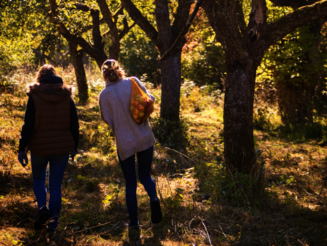 Zwei Frauen laufen im Morgenlicht über eine Streuobstwiese
