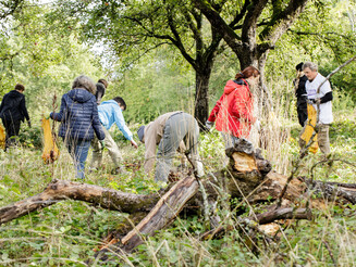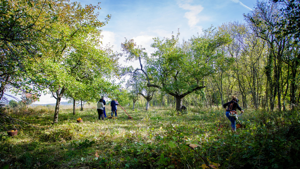 Mehrere Personen arbeiten auf einer Streuobstwiese