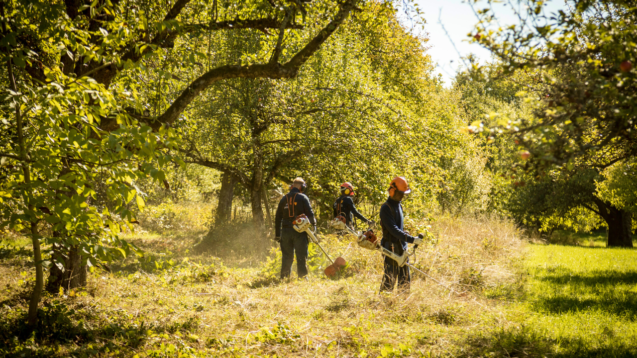 Drei Personen entbuschen eine Streuobstwiese mit Freischneidern