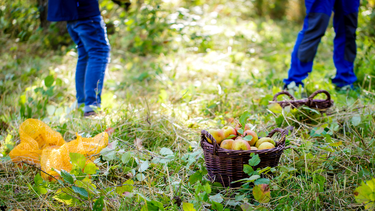 Mehrere Personen sammeln Äpfel vom Boden auf einer Streuobstwiese