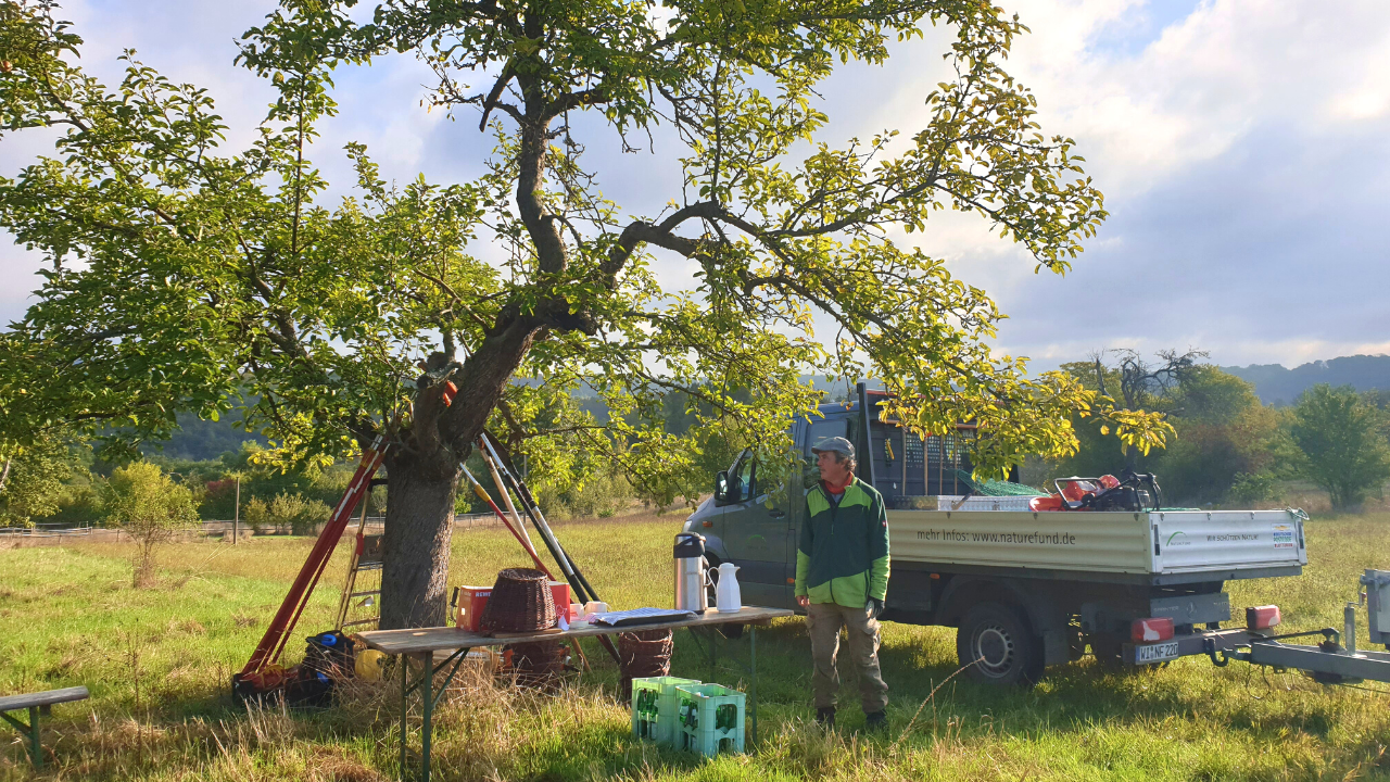 Ein Mann steht auf einer Streuobstwiese vor einem Auto