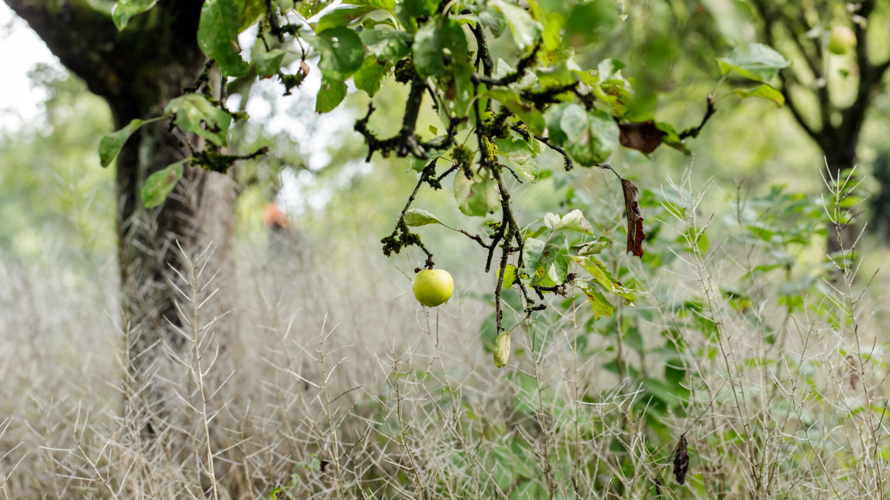 Ein Apfel hängt an einem Apfelbaum auf einer Streuobstwiese