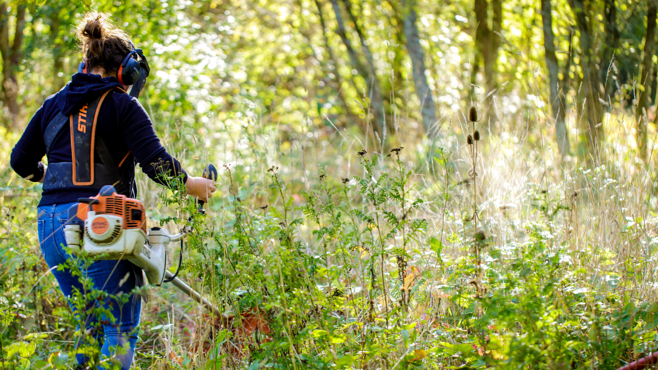 Eine Frau nutzt einen Freischneider, um eine Streuobstwiese zu entbuschen