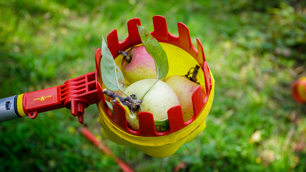 Mehrere Äpfel liegen in einem Pflückwerkzeug