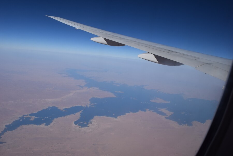 Al despegar el avión, tenemos buena visibilidad de la torre Eiffel, el jardín de Tullerías y el Museo del Louvre. Cruzamos los Alpes, volamos a lo largo de la costa italiana, aventajamos el Mar Mediterráneo y empezamos atravesar por África. Por horas solo veo arena incesante debajo de nosotros.