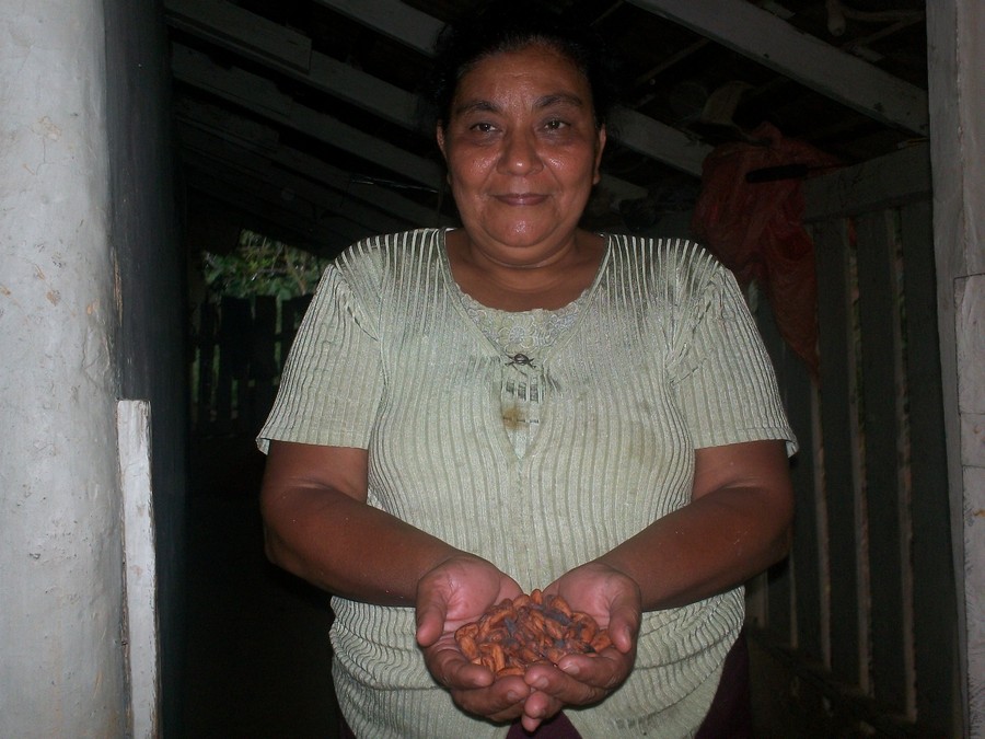 Fue una de las preguntas que nos contestó doña María, madre de uno de los productores de Las Milpas. Con su camisa blanca manchada por el trabajo casero que había hecho durante la mañana al preparar los alimentos para su esposo e hijo, previo ellos salieran al campo a su trabajo diario. ‘Mire Candy, antes que Chago (diminutivo de Alexander), comenzara con todo este cuento del bosque y de sembrar café y cacao, nosotros solo vivíamos de nuestras vaquitas. Así nos criaron nuestros papás; verá, yo no fui a la escuela, pero sí sé que las plantas son importantes. Yo tengo todos esos árboles de naranja y esos cacaotales en frente de la casa, por ese me doy el gusto de ver muchos animalitos comiendo’. Doña María interrumpió su plática para levantarse a ver los frijoles que tenía sobre el fogón. Familias como la de Alexander Guillén, se incorporaron a trabajar en una parcela agroforestal sucesional, tenían algunos árboles de cacao que doña María cuidaba porque le gustaba ver a las ardillas llegar a comer. ‘Nos costó un poco aprender que el bosque está para algo, ahora sabemos que podemos cosechar nuestros alimentos sin destruirlo. Ahora, mis nietos disfrutan el trabajar en la parcela, siempre tenemos plátanos, yuca, y ahora cacao, mire qué delicioso cacao’; doña María extendió sus manos y me enseñó un agrupado de semillas de cacao secadas y tostadas, listas para moler y hacer una pasta de cacao para chocolate.