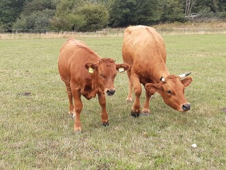 Mutterkuh steht neben ihrem Kalb auf einer Weide