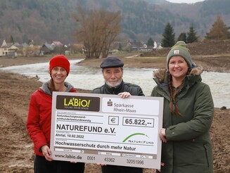 Scheckübergabe der Spende von LA'BIO! in Ahrweiler v.l.n.r.: Katja Wiese Naturefund e.V.; Winfried Sander BUND Ahrweiler und Danny van Leuven von LA’BiO!