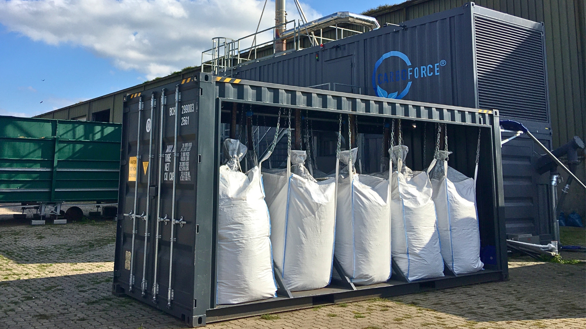 Pflanzenkohle entsteht in der Pyrolyseanlage von Carbo Force. Bei der Verkohlung von Biomasse entsteht dabei Wärme, optional auch Strom und Pflanzenkohle.
