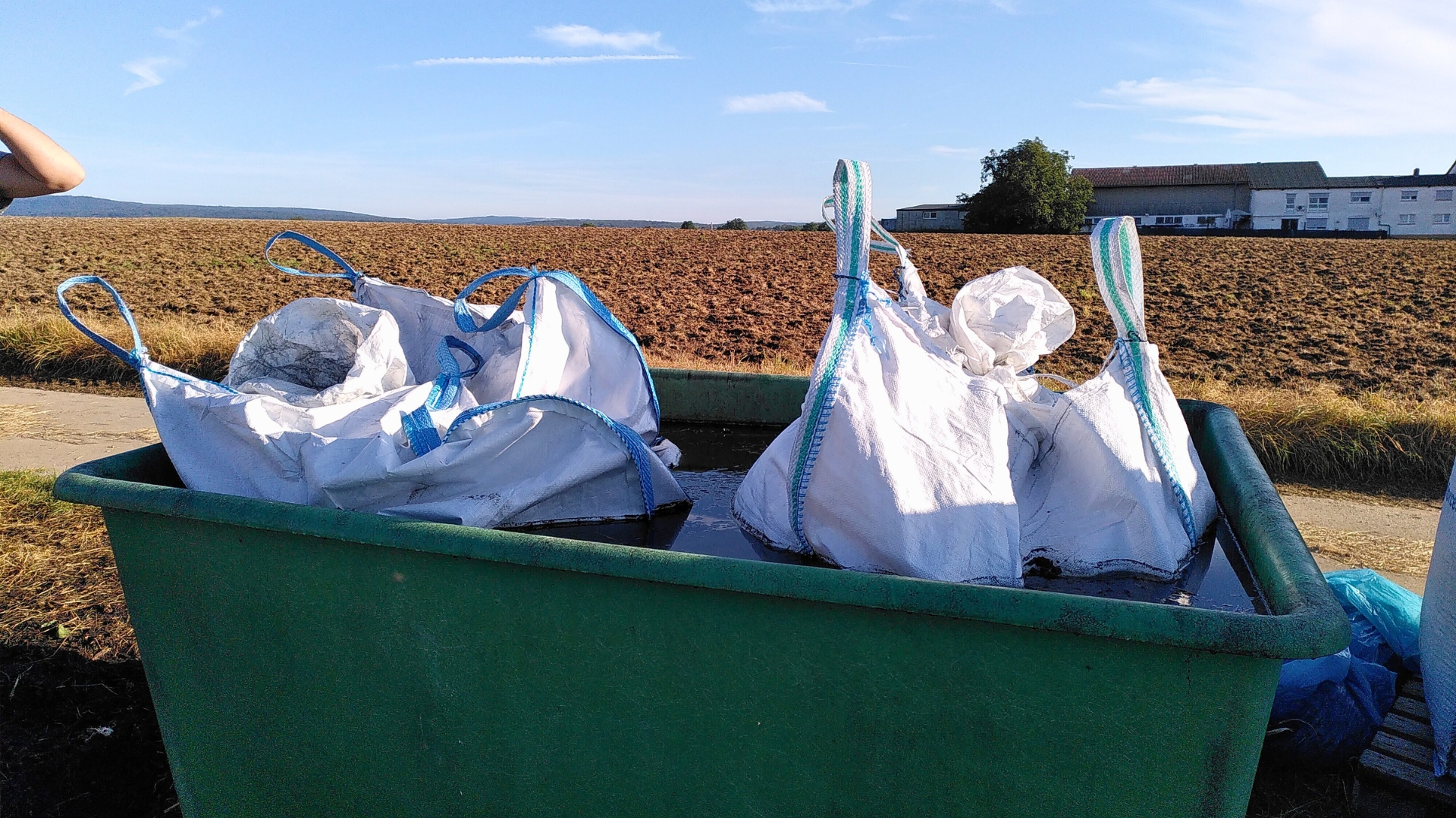 Die Pflanzenkohle wird mit Wasser, Kuhmist und Kompost für einen Tag imprägniert.