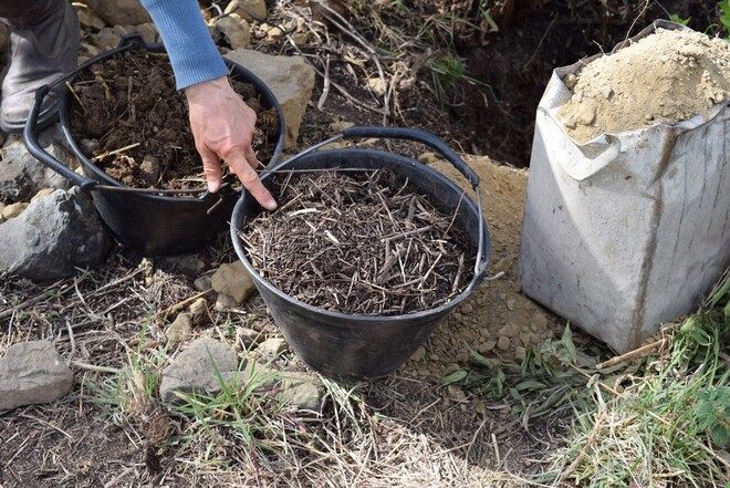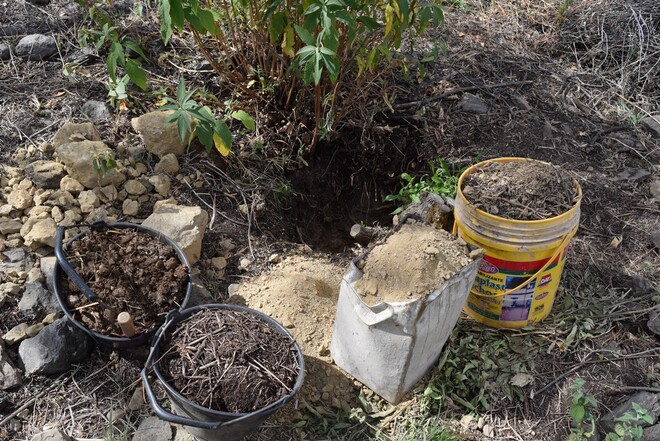 Las piedras más grandes se separan del material excavado. Luego el material excavado se mezcla con unas palas de abono, estiércol fermentado, hojas podridas y cualquier otra cosa disponible en el material orgánico. Si el suelo es muy margoso, es aconsejable hacerlo más permeable para regar, con unas palas de arena. Si el suelo es muy arenoso y pobre en nutrientes, se le debe dar una mayor cantidad de compost, estiércol u otro material orgánico. El sustrato de plantación mezclado debe llenar el hoyo de plantación casi completamente. Si hay problemas con los topillos, proteja las raíces con una barrera, por ejemplo, de alambre no galvanizado.