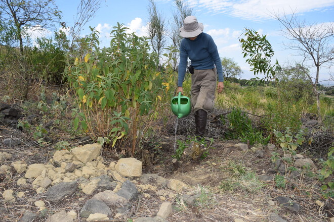 La planta recién plantada ahora necesita agua. El agua de riego se añade lentamente al anillo alrededor de la planta. Recomendamos al menos una regadera, en tiempo seco puede ser de hasta tres latas llenas.
