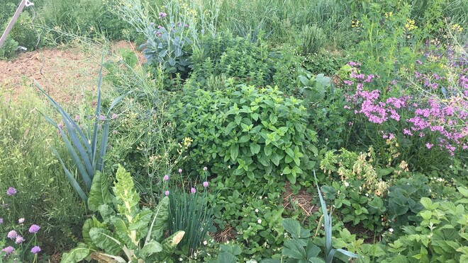 En la esquina de la parcela plantamos un tomillo, una planta perenne que proporciona un soporte permanente en el sistema de raíces para las plantas cultivadas, en su mayoría anuales.