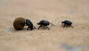 Drei Dungkäfer laufen hintereinander wobei der Vorderste eine Dungkugel rollt