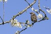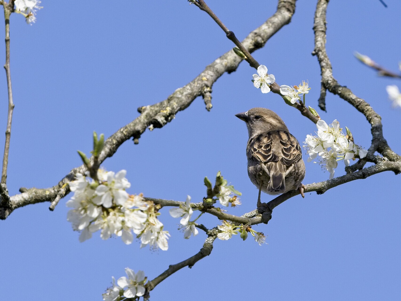 Sperling sitzt auf Ast mit weißen Blüten