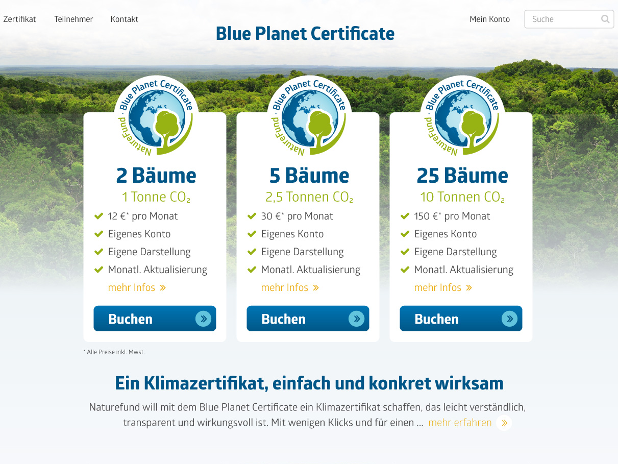 Jedes Unternehmen, welches das Blue-Planet-Certificate trägt, kann jederzeit auf der Website von Naturefund verfolgen, wie hoch sein Beitrag konkret zur Kohlendioxid-Kompensation ist. Ein Baum - das Symbol des Zertifikats - steht beispielsweise für die Kompensation von 500 kg CO₂.Katja Wiese von Naturefund ist überzeugt: „Auch wenn die Weltklimakonferenz Ende November in Paris wieder mit enttäuschenden Ergebnisse enden wird, zeigt uns das vor allem eins: dass jeder von uns handeln muss. Gemäß dem Motto: Es gibt nichts Gutes, außer man tut es!“ Für Firmen, die klimaneutral arbeiten möchten, ist dies ein einfacher Weg, der sich auch wirtschaftlich lohnen kann. Nach einer Studie des E-Commerce-Center Handel in Köln wirkt sich ein Gütesiegel positiv auf die Vertrauenswürdigkeit von Onlineshops aus. Mehr über das Blue Planet Certificate: blueplanetcertificate.com/zertifikat/ Zu den Pressefotos: www.naturefund.de/pressefotos