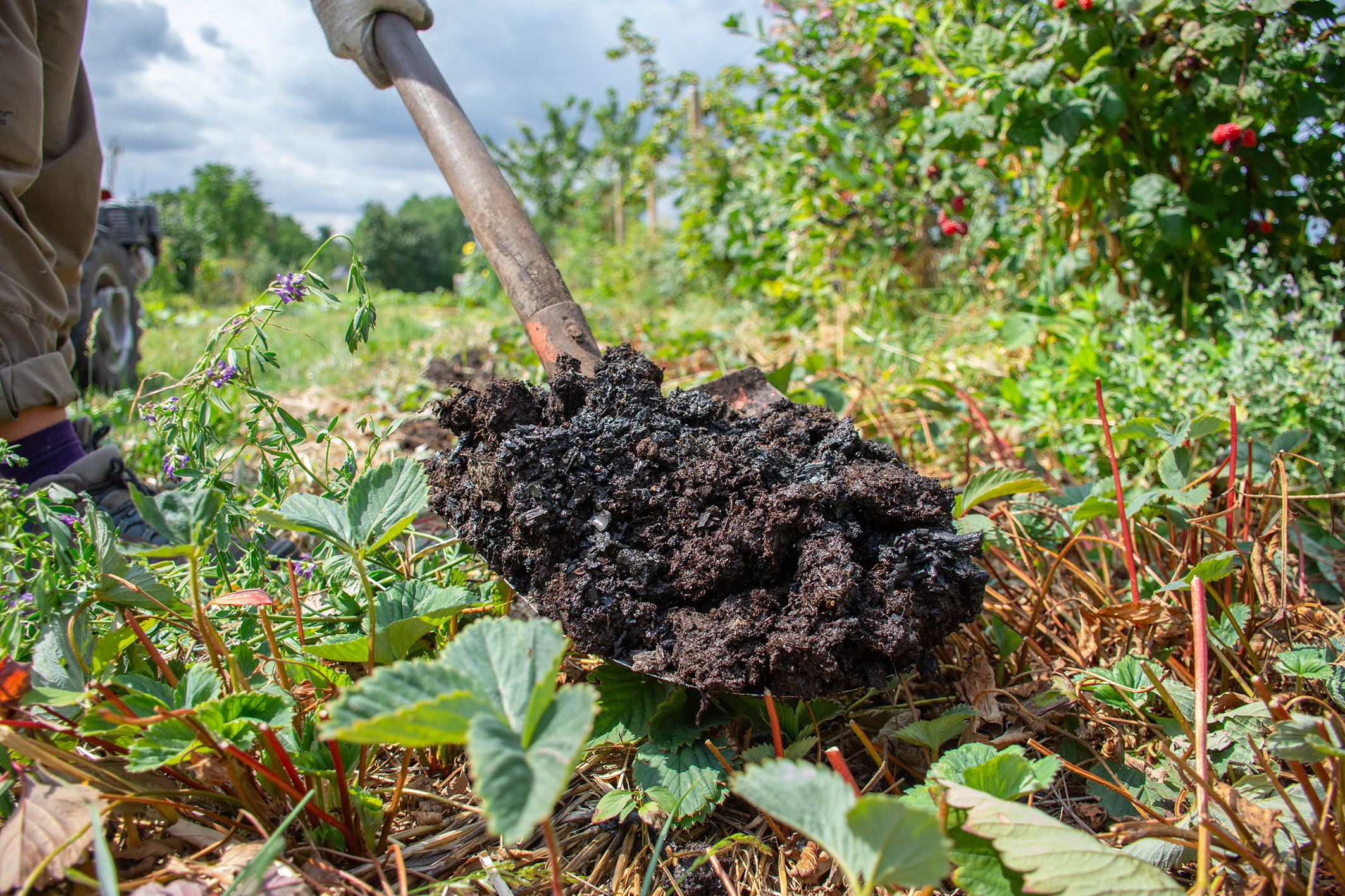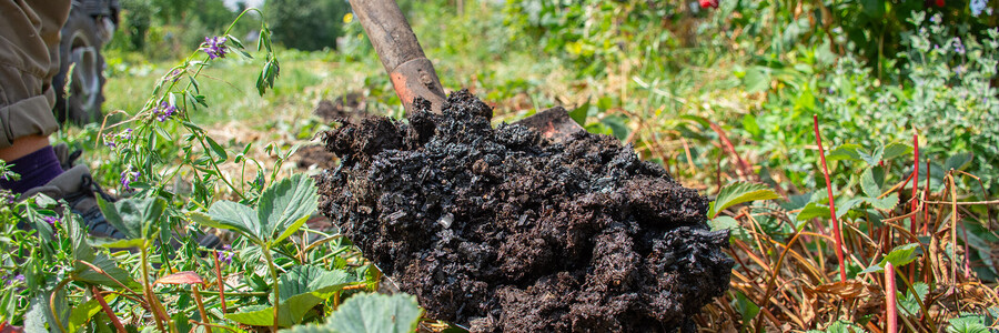 Bildunterschrift: Der Boden wird mit Nährstoffen angereichert, hier eine Mischung aus Pflanzenkohle und Kompost. Foto: Naturefund