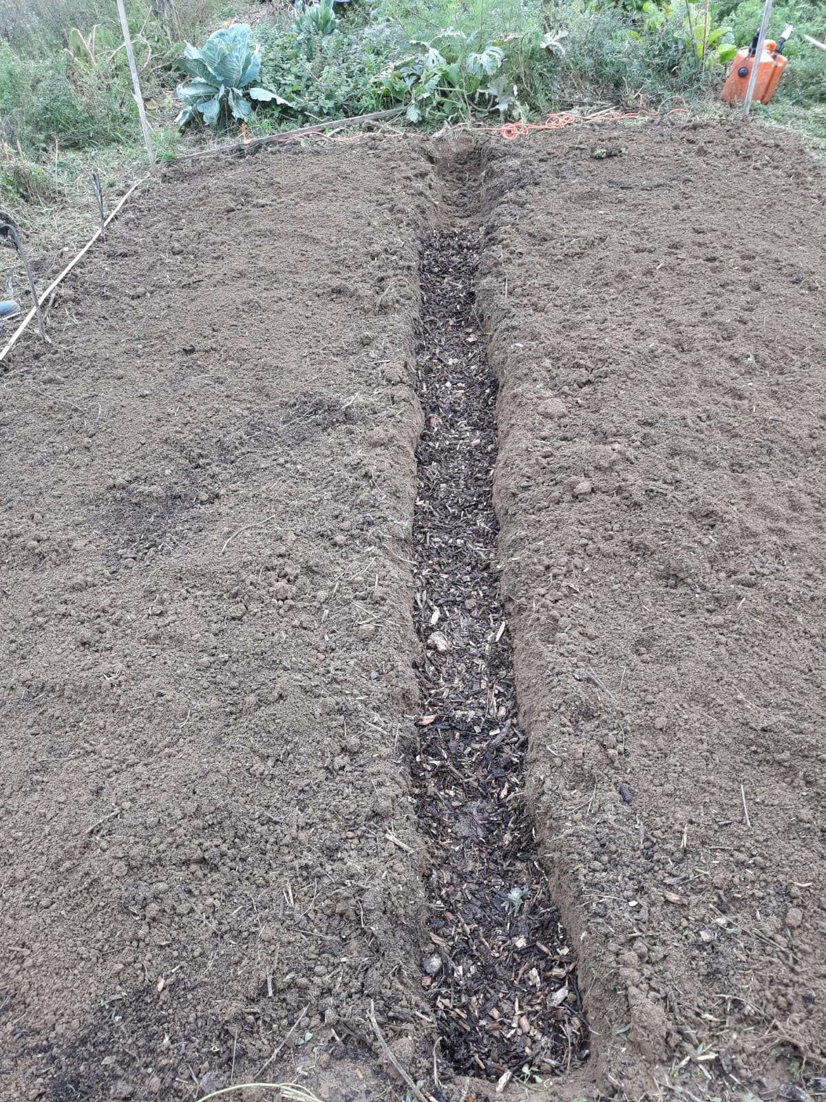 Um sich in der Parzelle bewegen zu können, ohne die angebauten Pflanzen zu beschädigen, wurden von zwei Seiten aus ein Graben durch deren Mitte gezogen. Dieser wurde anschließend mit Hackschnitzeln und Pflanzenkohle gefüllt. Dadurch werden die einzelnen Elemente der Parzelle strukturiert. Zudem wird im Füllmaterial Wasser gespeichert, welches zu trockenen Zeiten an den Boden abgegeben wird. So muss das Feld nicht andauernd bewässert werden.