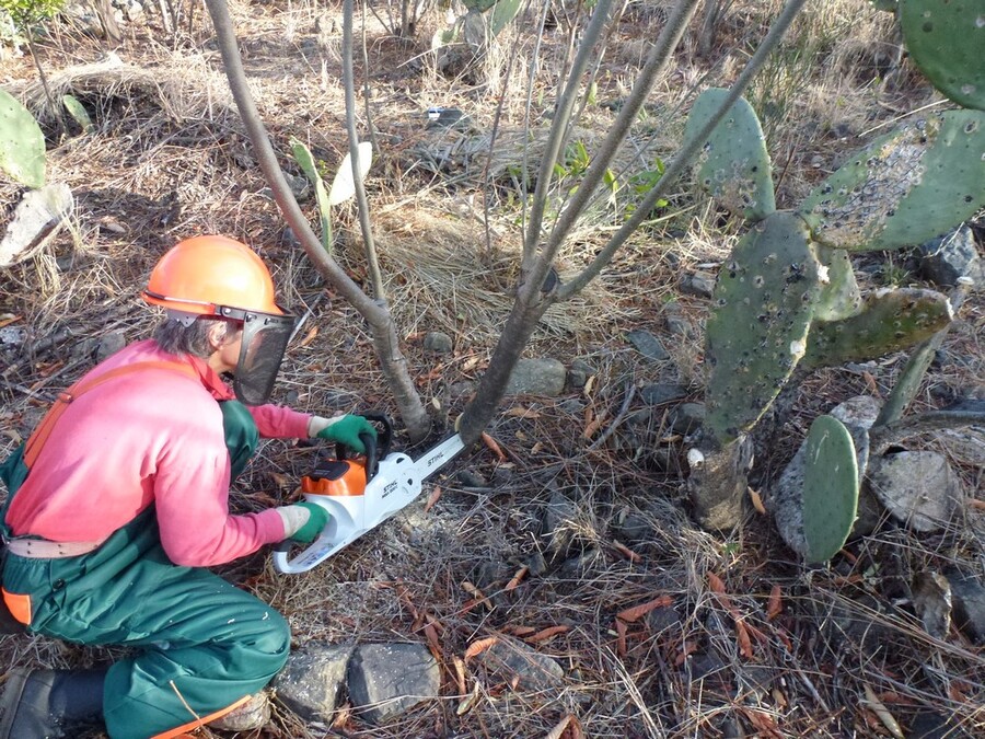 Hier sehen wir eine Jacaranda, die schneller wächst als die Kaktee in ihrer Nähe. Anfangs gab die Kaktee der Jacaranda Schutz und half ihr schnell zu wachsen. Jetzt ist die Jacaranda größer geworden und beeinflusst die Kaktee negativ (zu sehen an den Pusteln auf den Blättern). Um der Kaktee wieder zu mehr Kraft zu verhelfen, geben wir ihr wieder etwas Raum.