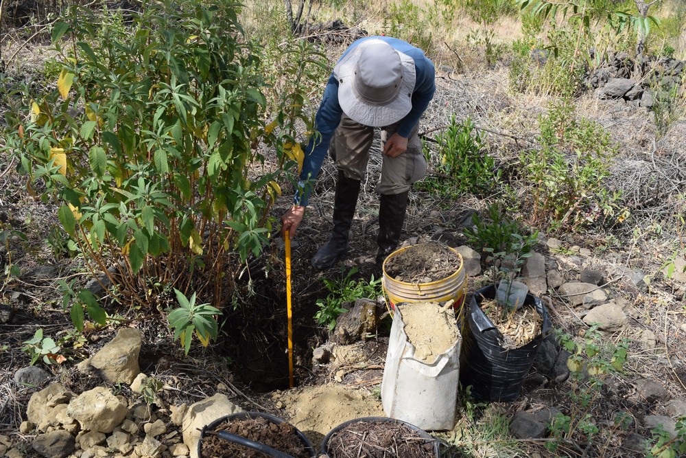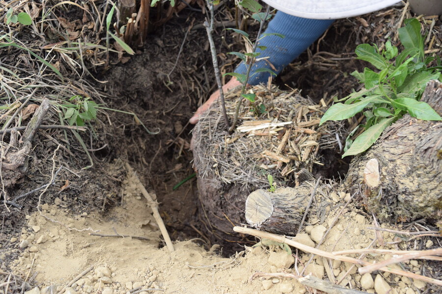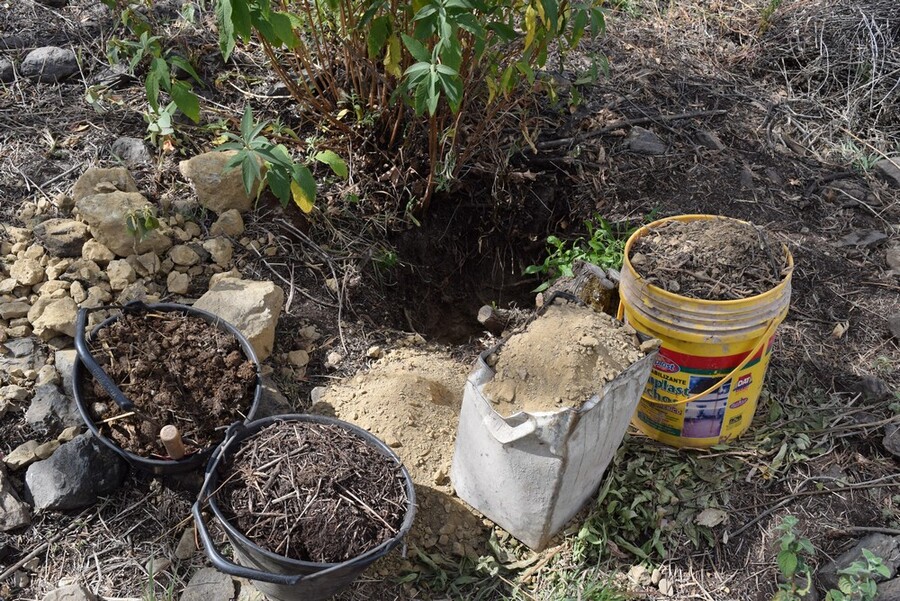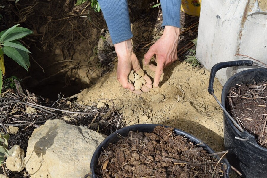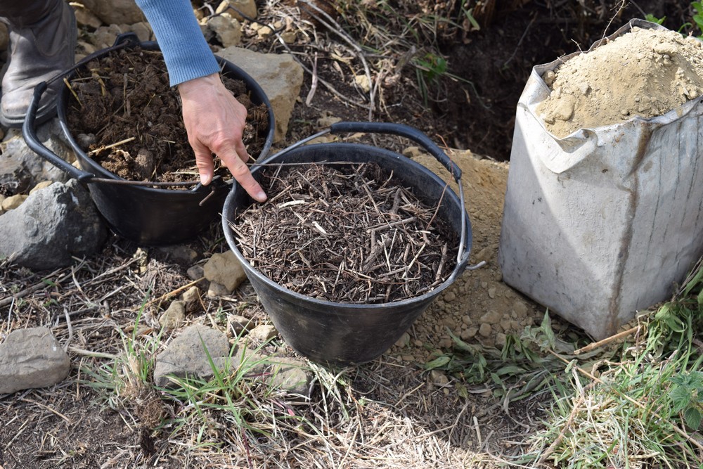 Größere Steine werden aus dem Aushub aussortiert. Dann wird der Aushub mit ein paar Schaufeln Kompost, vergorenem Mist, verrottetem Laub und was sonst noch an organischem Material vorhanden ist vermischt. Bei sehr lehmiger Erde ist es ratsam, diese mit ein paar Schaufeln Sand wasserdurchlässiger zu machen. Falls die Erde sehr sandig und nährstoffarm ist, sollte sie dementsprechend eine größere Menge Kompost, Mist oder anderes organische Material erhalten. Das vermischte Pflanzensubstrat muss das Pflanzloch fast vollständig füllen. Bei Problemen mit Wühlmäusen, schützen sie die Wurzeln mit einer Sperre, z. B. aus unverzinktem Draht.